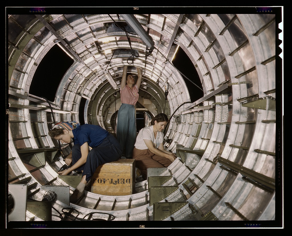 Title: Women workers install fixtures and assemblies to a tail fuselage section of a B-17F bomber at the Douglas Aircraft Company, Long Beach, California, USA. October 1942.